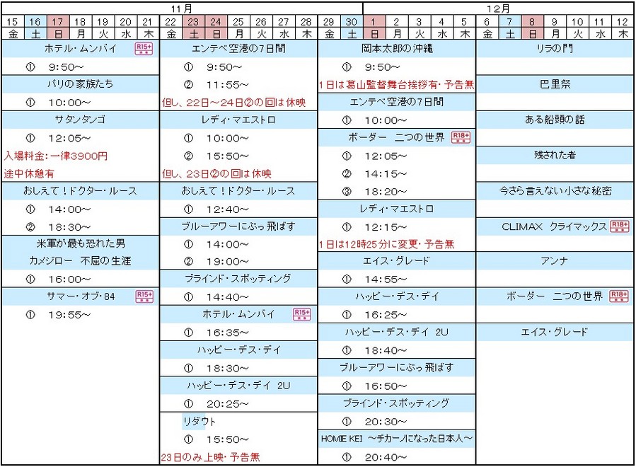 | ☆ ☆各回完全入替制。上映開始後のご入場はできません ※県の条例により、上映終了が23:00を過ぎる上映回(時間の後に★印)は 18歳未満(高校生以下)の方は保護者同伴でもご入場いただけません。 |